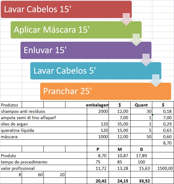 A planilha de Formação de Preço de Vendas acima permite balizar toda a Operação Comercial e de Serviços nos Salões de Beleza e clínicas de Estética, baseadas nos custos, internos, prazo de estocagem, forma de recebimento tanto do ponto de vista de margem de contribuição objetivada quanto comparativamente ao preço de mercado.